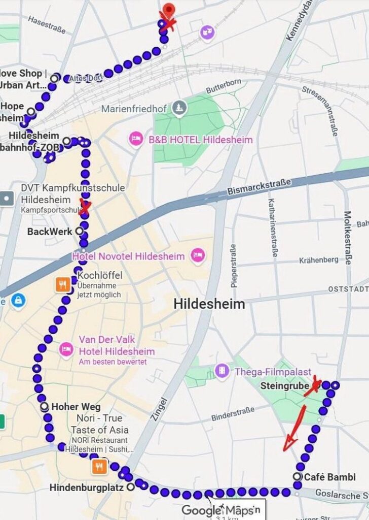 The route is wheelchair accessible. There are seating areas at all three rally locations. At Steingrube, there are public wheelchair-accessible toilets that can be used for 50 cents. At Ottoplatz, the toilets in the Blank tattoo studio and Kunstraum53 can be used. These are not barrier-free.